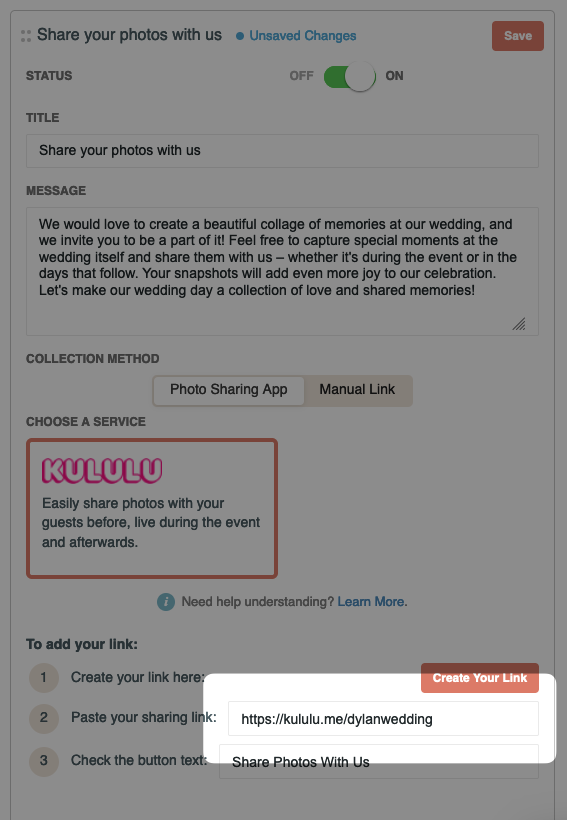 Copy your photo sharing link. If you have already entered it as a website link, you can go to your Wedding Website to find the link
