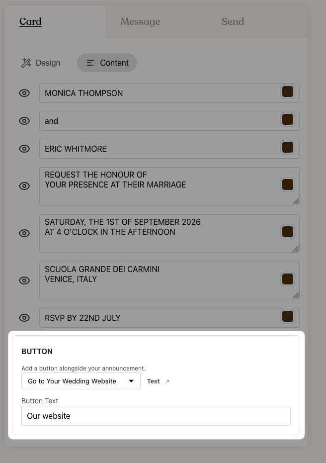 You can link your guests to your website or any of your forms from your Announcement card (like invitation or save the date), so when they click the button they land on your desired page. Here’s how to set that up: